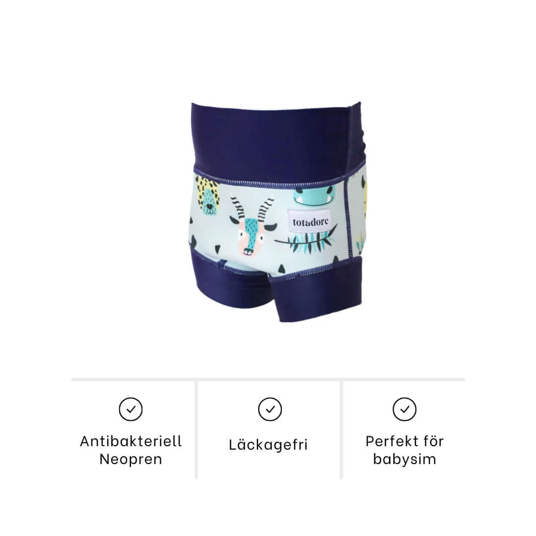 Med våra hållbara badblöjor, tillverkade i neopren, får barnet en bekymmersfri simupplevelse. Tack vare resår kring midja och lår sluter de tätt och är läckagesäkra. Du slipper oroa dig för små missöden i poolen och kan istället njuta av tiden tillsammans med ditt barn!